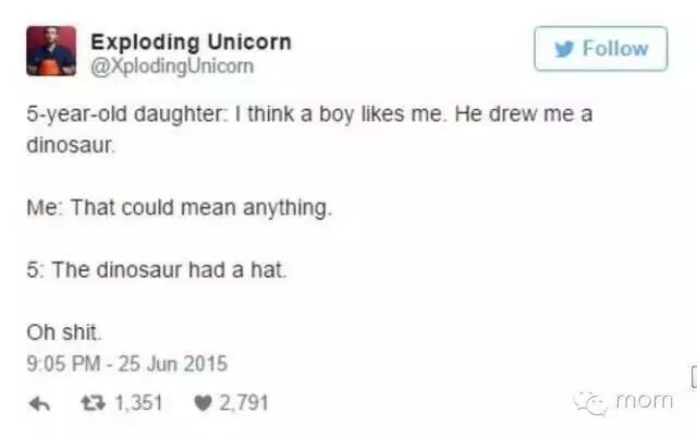 5岁女儿:我觉得,有个男孩喜欢我。他给我画了一只恐龙。爸爸:可能有别的什么意思。