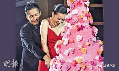 梁朝伟和刘嘉玲环抱切蛋糕。 陈泰铭和关之琳携手上台祝酒。