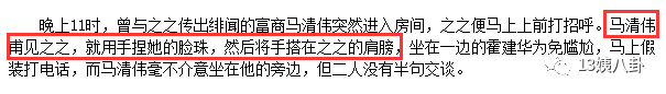 然而更微妙的是,马清伟也突然现身当晚的派对。《明报周刊》报道称: 马清伟甫见之之,就用手捏她的脸珠,然后将手搭在之之的肩膀。坐在一边的霍建华为免尴尬,马上假装打电话,而马清伟毫不介意坐在他的旁边,但二人没有半句交谈。