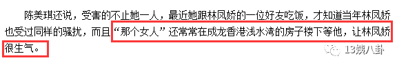 陈美琪的爆料还涉及到另一个人,成龙的妻子林凤娇。 她说,林凤娇当年也受过同样的骚扰,“那个女人”还常常在成龙香港浅水湾的房子楼下等他,让林凤娇很生气。