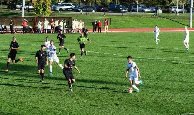 (身着黑色队服的哈佛男子足球队在早先的一场比赛中。图片来源于:nytimes.com,版权属于原作者)