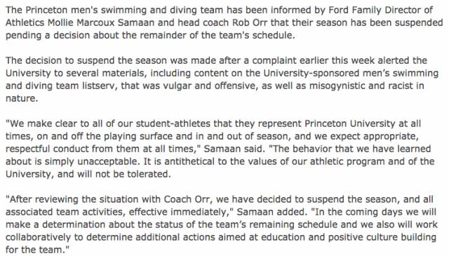 上星期,普林斯顿大学男子游泳/跳水队因散播歧视言论遭校方禁赛处理。