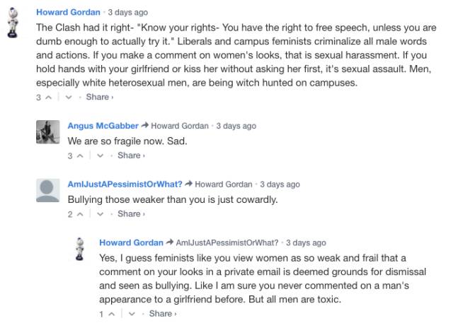 一楼评论说:男性、尤其是白人男性才是校园歧视受害者!这年头女权主义简直要上天,你评论一下女人的长相,是性骚扰,你和女朋友拉个小手、亲个小嘴之前不获得对方同意,也是性骚扰...人生好艰难...