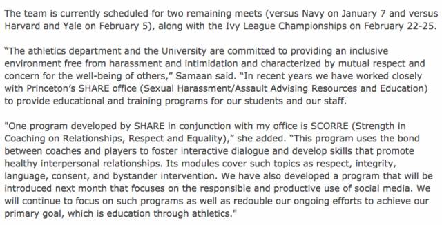 这份停赛处分意味着普林斯顿大学游泳/跳水男队不仅将会错过本赛季与哈佛、耶鲁等劲旅的切磋良机,更将错过明年2月底举行的常春藤高校冠军赛。