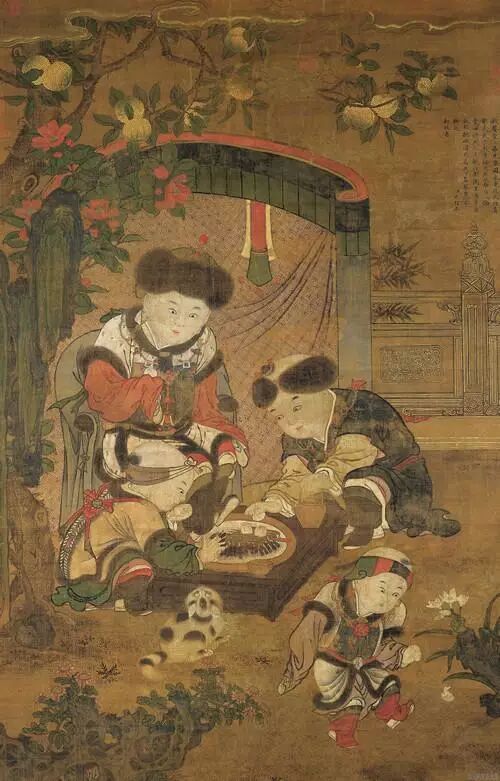 堂前立起了屏风,孩童三人围炉打算热包子来吃,一人在旁玩耍,看这群小朋友头戴皮帽,身穿厚袄的衣服装束,当时应是冬日光景。炉上的包子冒出热气,象徵「同胞一气」之意。包子的香味把猫咪也引来了,仰头等在炉边的小花猫,一脸好希望旁边哪位小朋友能够分一点包子给牠嚐嚐的样子。' u9 m' m% A% D: W- o x