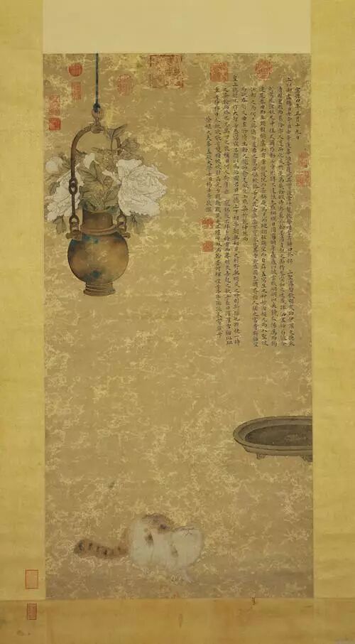 根据题跋,这幅画是明宣宗画来赏赐大臣杨士奇的,画中猫咪好奇的仰望头顶上插著牡丹花的悬吊铜壶,好像正在打算要跳上去看个明白。猫谐音为耄,祝颂长寿,并以牡丹寓富贵。画猫用笔精细,纤毫毕至。铜壶花器虚悬,置花三朵,中间绿叶渐层而上,盖过壶把,极富轻盈之趣。5 n, Z2 Y+ o# E