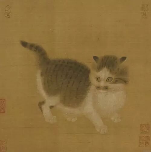 古人称猫为「狸奴」,深受文人雅士所锺爱,也是历代画家喜好描绘的题材之一。本幅选自「宋元名绘」册第十幅。这隻黄白相间的小猫似乎突然受到前方的不明惊扰,瞠目举足,状欲退缩。样子十分敏捷可爱。画家不厌其烦的一笔笔画出小猫全身纤细的毫毛,并在小猫胸前用粗笔染以白粉,做出长毛结缕的立体视觉效果。染绘斑纹亦颇具功夫。画幅右上角有「甲午岁李迪笔」之款,其下方则有块长方形之接痕,该处或原有款印,被割去而重新填补者。5 D" m. O: x3 N8 @7 C' R