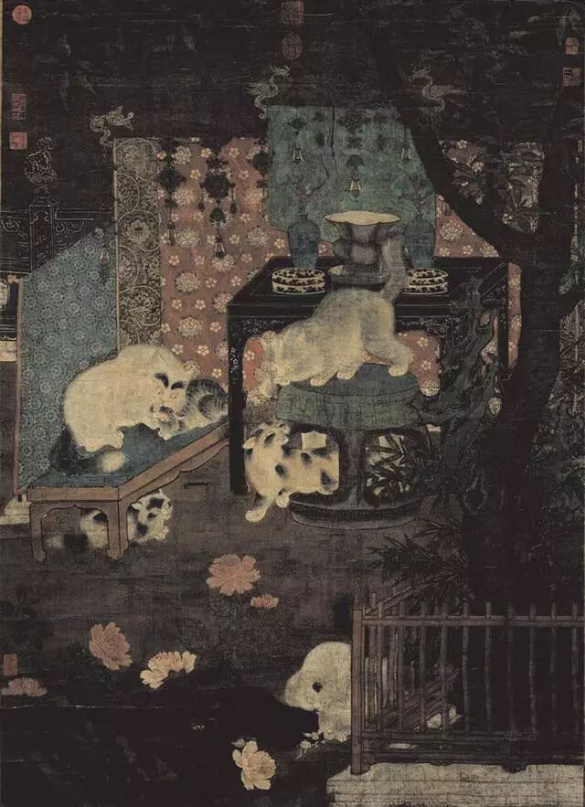 6 T' a* R, q+ _; M, F, A8 M% {一隻黑白花的猫儿伏在牡丹花丛下,颈后露著短短两截红色的缎带,加上身后那条长毛整整齐齐呈平行线的猫尾巴,显示这隻猫咪有专人梳理打扮,被照顾得很好。唯一的美中不足,可能是被绳子栓在石铃上,行动不得自由吧。从本幅沉稳厚重的著色、充满细节与变化,立体感十足的写生技巧推断,应是十一世纪左右北宋宫廷画家所画的作品。
