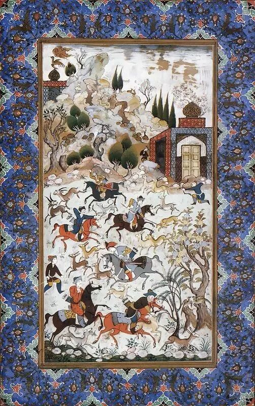 : ]0 q$ i9 |+ w$ a4 r* K* N波斯细密画( Persian miniature)波斯(1935年改称伊朗)中世纪艺术的一个重要部分。是在手抄经典或民间传说、科学等书籍中,和文字相配合的一种小型图画。始于《古兰经》边饰图案,14~16世纪为其全盛期。早期画风受希腊、叙利亚等艺术的影响,色彩美丽,富于装饰性,至13世纪吸收中国绘画的一些方法而注意运笔和山水画程式的运用。主要画家有比塞特等。