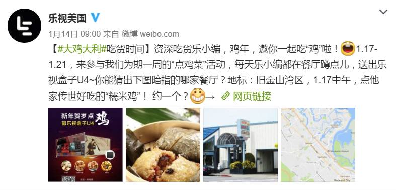 " B4 x; o- V- _. _7 N' [ ]. E前几日,乐视美国在硅谷、西雅图的十家以“鸡”出名的餐厅举行了为期一周的“新年贺岁点鸡”活动,不仅有镇店名菜“糯米鸡”、“地锅鸡”等,更送出了10台价值$79.99的乐视盒子U4。0 _& r5 c/ W0 [, Q- d) E& L