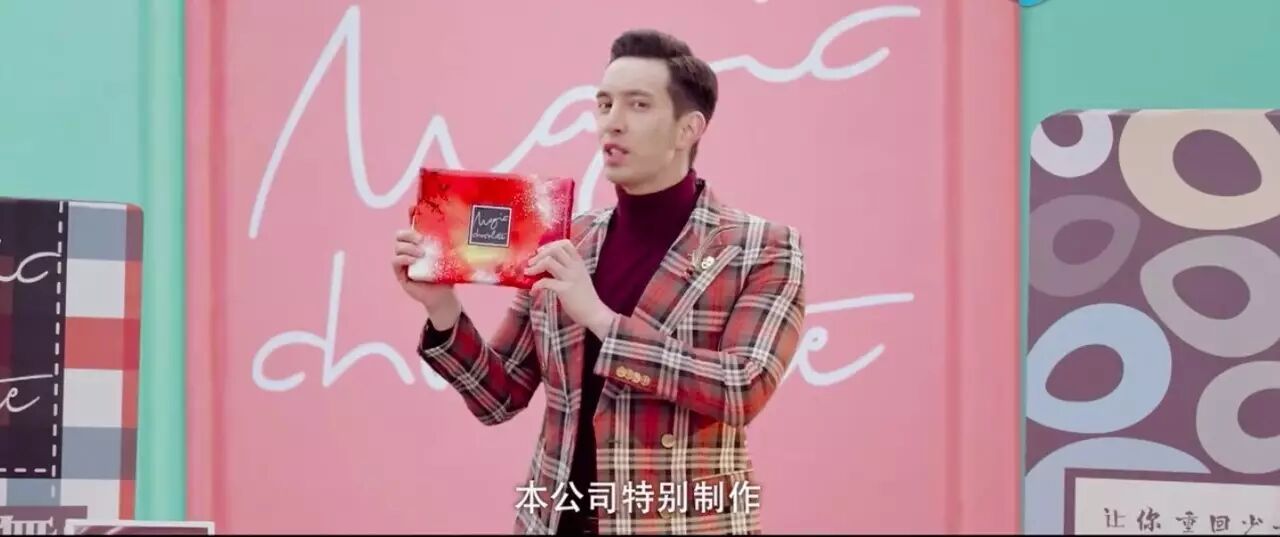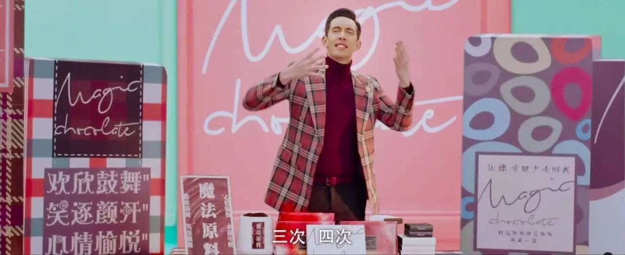 在电影中Mike隋饰演一个巧克力商,他在电视上卖的这款“欢欣鼓舞笑逐颜开心情愉悦永远年轻奇幻巧克力”就是倪妮饰演的女主吃下去后重返17岁的神奇巧克力。