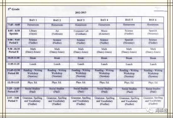 这是一张美国普通小学生的课表,课表上每天都会上的课除了语言艺术,数学,科学,社会学,还有一门是体育课。每周还有一次美术课,音乐课,电脑课,两次第二外语西班牙语课。 从中我们可以看出,国外的小学教育学习的东西是很宽泛的,更多的是在于让孩子们了解和认识世界,更注重广度而非深度,在于培养孩子们的兴趣。 【语言艺术:被划分为好几门课,包括阅读,写作,拼写,语法。 数学:和国内的相比起来,教学范围是差不多的,但是教学难度相对简单,这里的老师不强调做题的数量和计算的速度,他们更注重教会孩子把数学概念灵活地运用到生活中。 科学:学习的内容很广泛,图文并茂的课本里除了涉及到简单的物理,化学,生物,地球学等学科。当然,这个小学阶段,还是以最基本的科学概念和知识为主,选取的内容也不难懂,基本都是日常生活中都能遇见的。 社会学:这也是一门综合性的学科,在小学阶段,主要是介绍简单的美国历史和本州的历史,在历史的介绍过程中,也会提及宪法,公民的权利与义务,地理等。】 资金准备:在美国读私立小学每年的费用(包含学费生活费)约为2万~5万元美元不等。