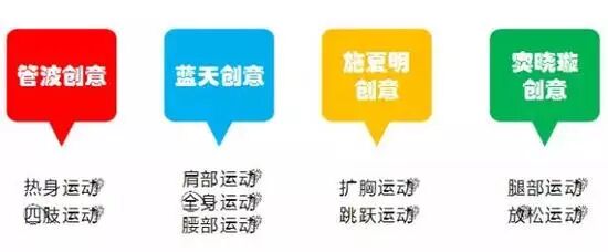 % j: d$ }% w- N# r最终确定下来的九节, 包括热身运动、四肢运动、 肩部运动、全身运动、 腰部运动、扩胸运动、 跳跃运动、腿部运动、放松运动。