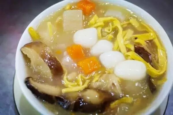还有咸汤圆。用虾干、蛋皮、香菇、红白萝卜粒为底,满满一碗,直接可以当饭。 9 b+ K- K$ E' X! q4 L; @