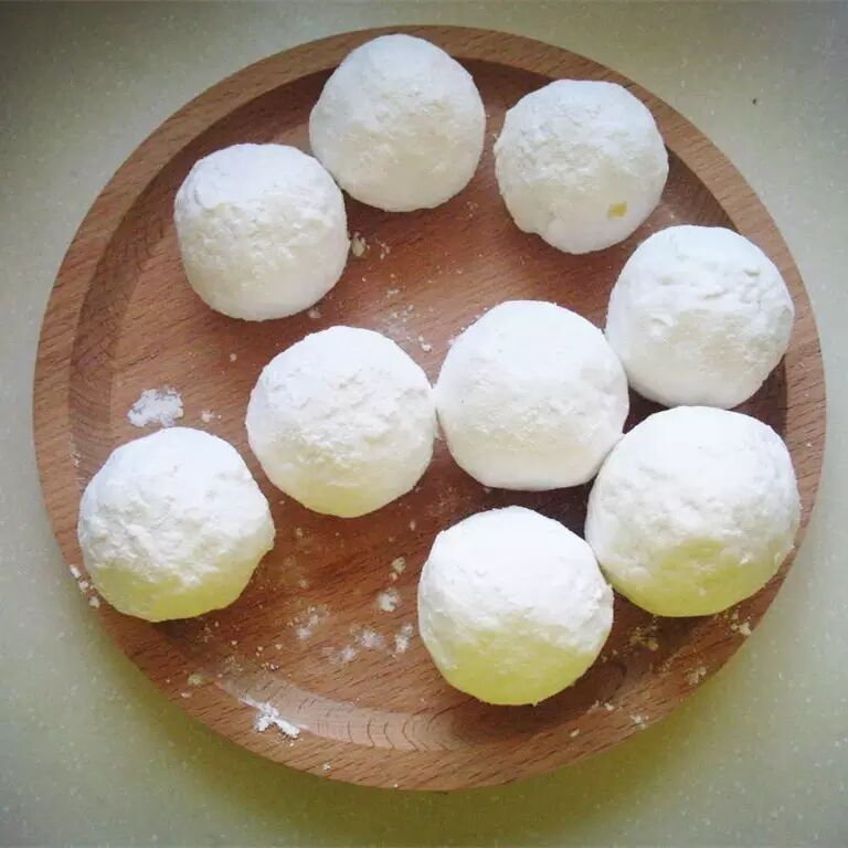 沾水后,将这些馅料将被放到盛粉的笸箩中摇,使其翻滚。滚得厚点了沾水继续滚,直到成变符合大小的圆球。 ( w: i# t; X: Z d: I0 V( n$ _