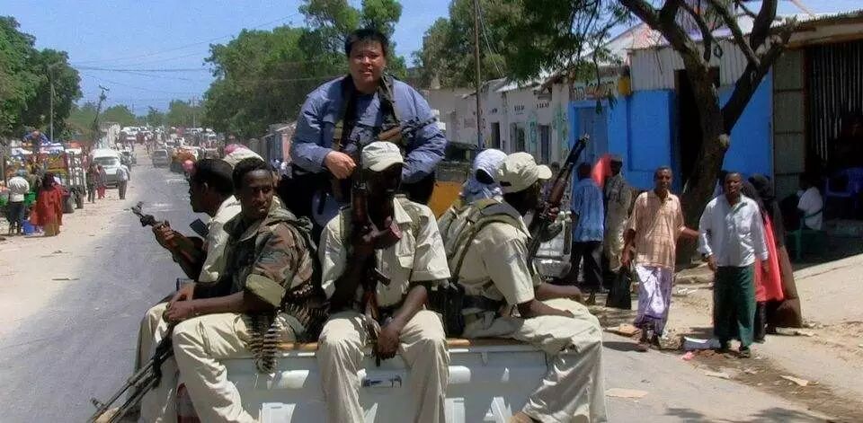 张昕宇手持步枪在索马里摩加迪沙,周围是安保人员