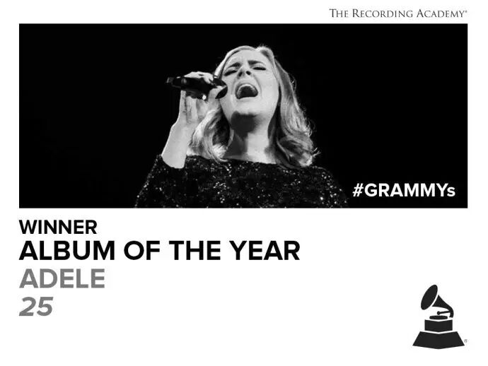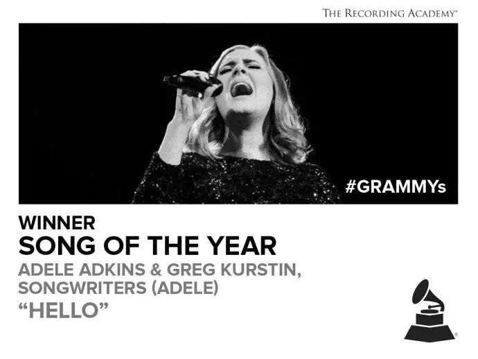 # h0 e9 n3 l2 i. JAdele凭借《Hello》和《25》,横扫年度最佳专辑、年度最佳制作、年度最佳歌曲、年度最佳流行女歌手以及最佳流行专辑5项格莱美大奖,5提5中,成今晚最大赢家!