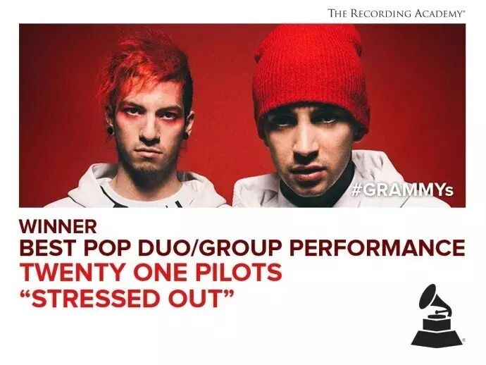 5 y# n! t& f) n- o21飞行员(Twenty One Pilots)凭借《Stressed Out》(网友说是英文版《听妈妈的话》)获得格莱美年度最佳流行二人组/合唱艺人奖!/ K, G+ T( @6 @' f