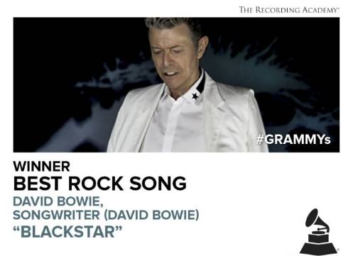 David Bowie遗作《Blackstar》获年度最佳摇滚歌曲、年度最佳另类音乐专辑、最佳唱片包装、最佳非古典工程专辑,宝哥本人也拿下年度最佳摇滚艺人!今晚5座格莱美,虽然再也不能到场,依然是音乐大赢家! 0 ]. V9 n: J# [5 |% a4 f