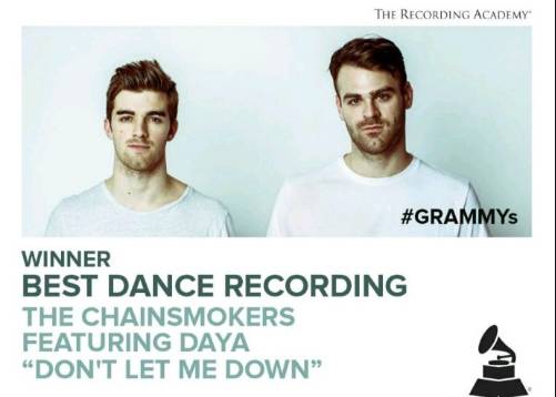 The chainsmokers凭借大热单曲《Don't let me down》拿下本届格莱美最佳舞曲唱片。烟鬼自从出道以来带来了很多大热单曲,也恭喜他们获得格莱美奖项的认可!" P* J: n' U+ ?1 q$ Z