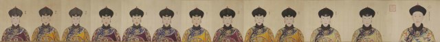 + r0 Q" }% ?3 c0 i# a郎世宁著名的画作《乾隆及后妃图卷》(又名《心写治平》),是乾隆元年(1736年)郎世宁与他的弟子、以及宫廷画家续画的乾隆皇帝和皇后、十一位妃嫔画像,现流落藏于美国克利夫兰博物馆。 % Y3 C1 h2 @# g1 |. {# v