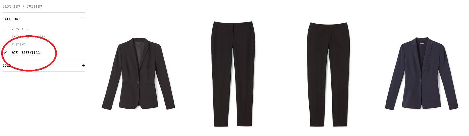 ' R ]; o1 r9 x8 }2 v这几个小字放大了看是work essentials ,就是职场基本款,真的非常少,就这么有限的几种,西装、衬衣、西裤、半裙。▼ 4 F% x6 W' S6 }1 K' @4 i