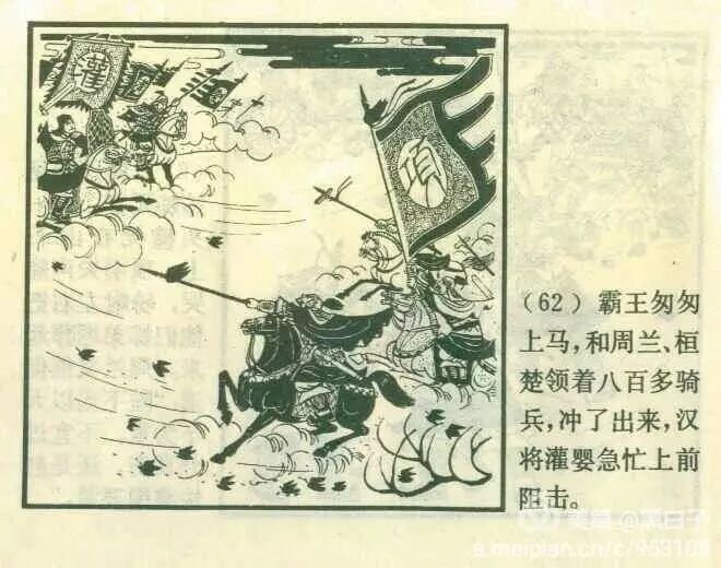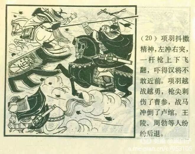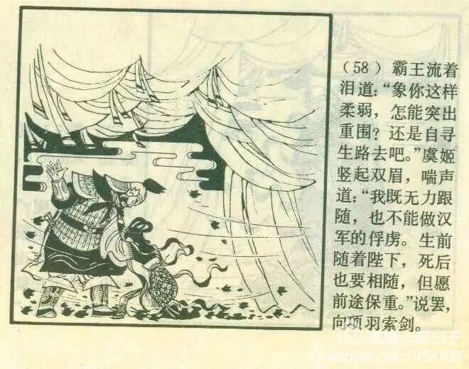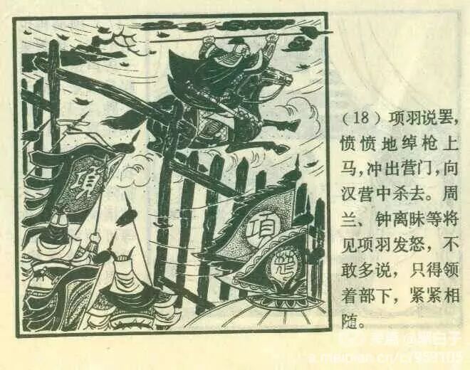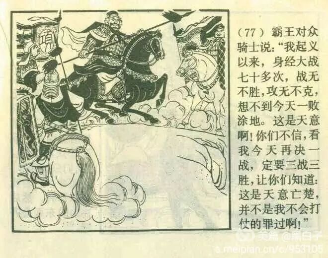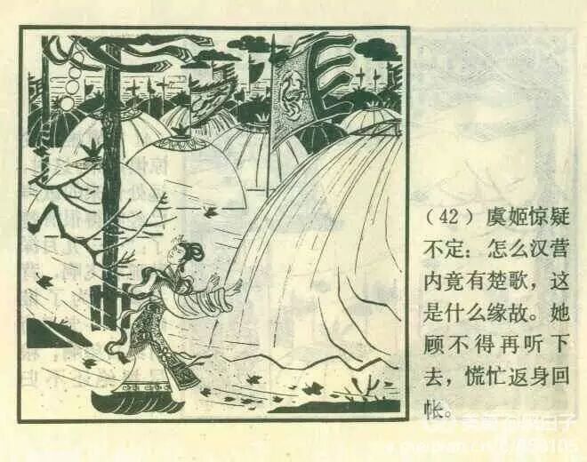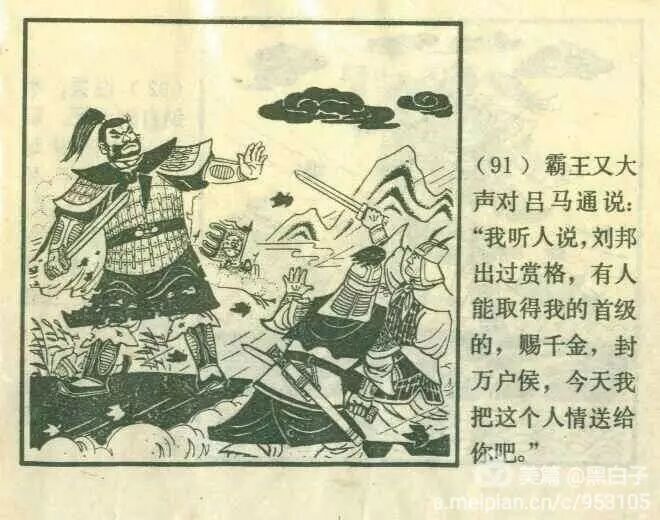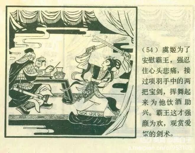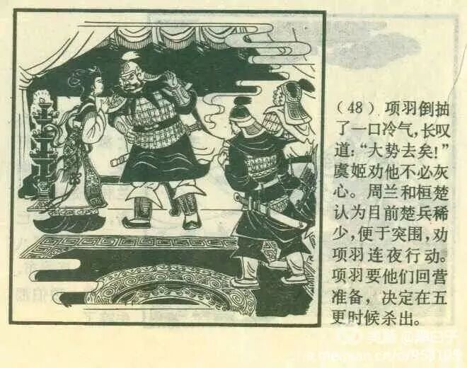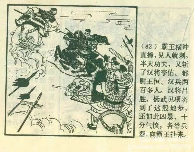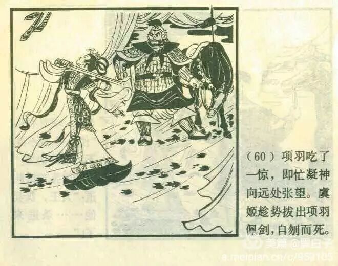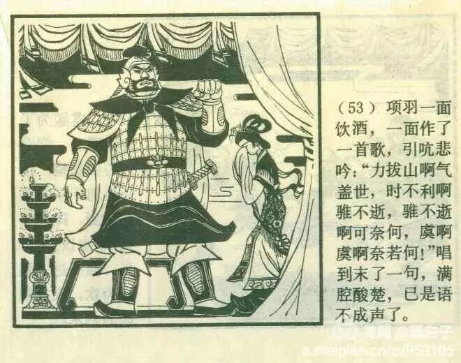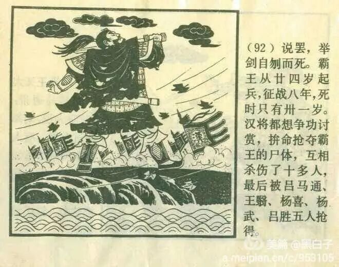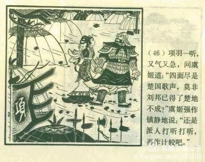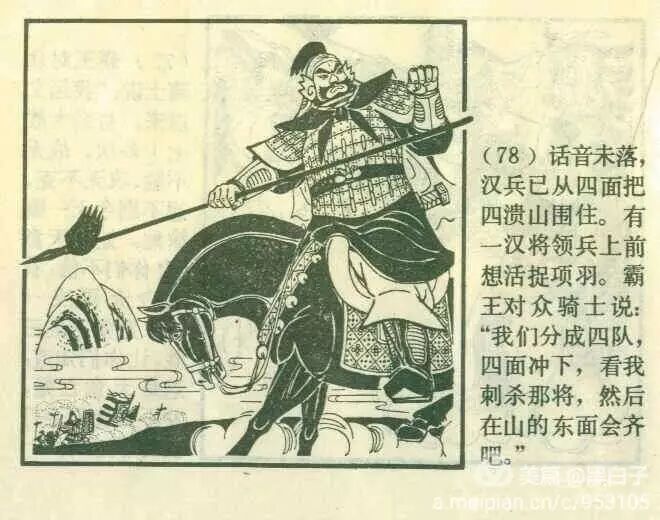 1980年由上海人民美术出版社出版,根据历史故事改编的连环画《霸王别姬》,讲的是力拔山气盖世的项羽于垓下四面楚歌,乌江自刎别虞姬的悲壮故事。