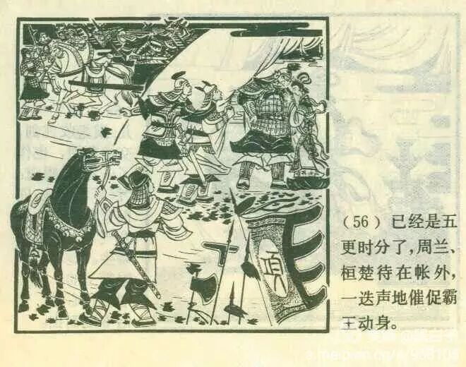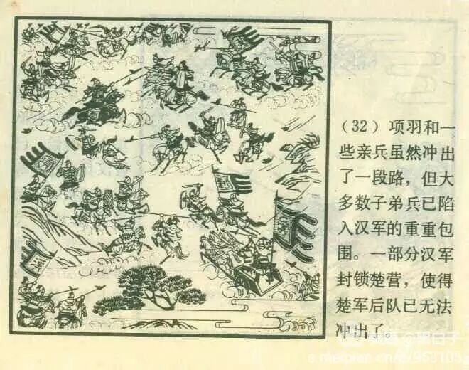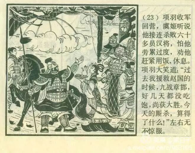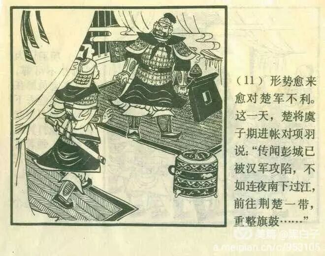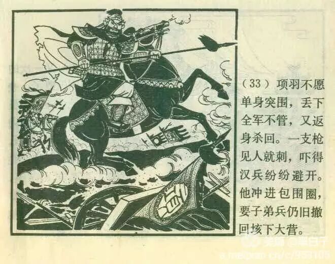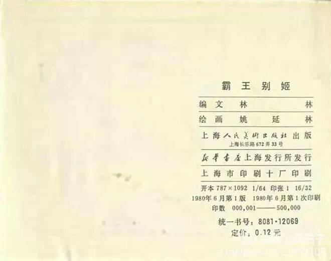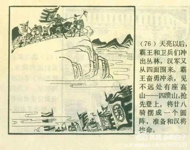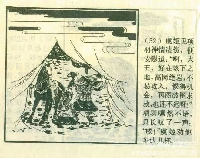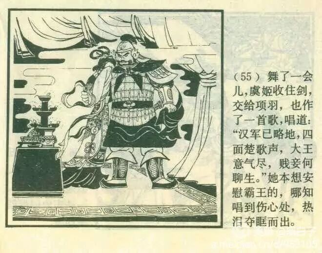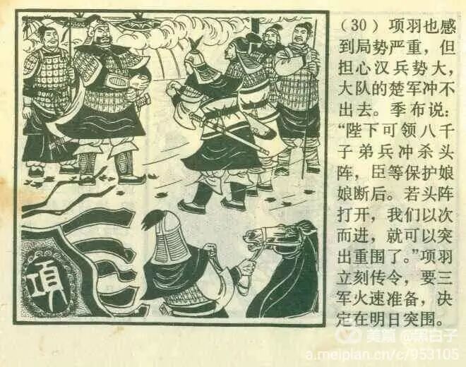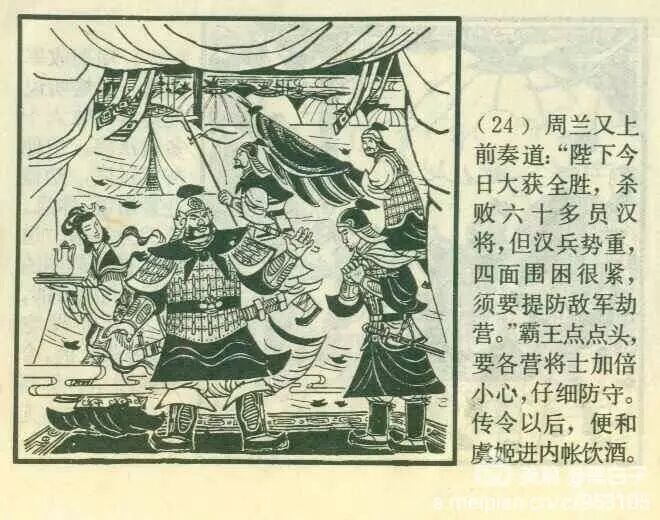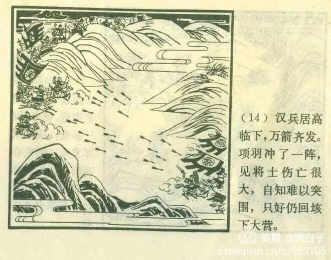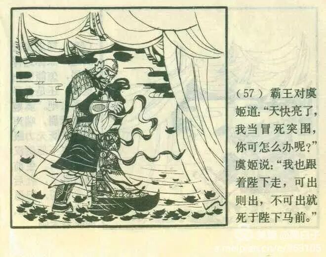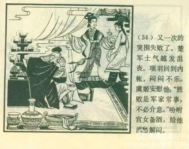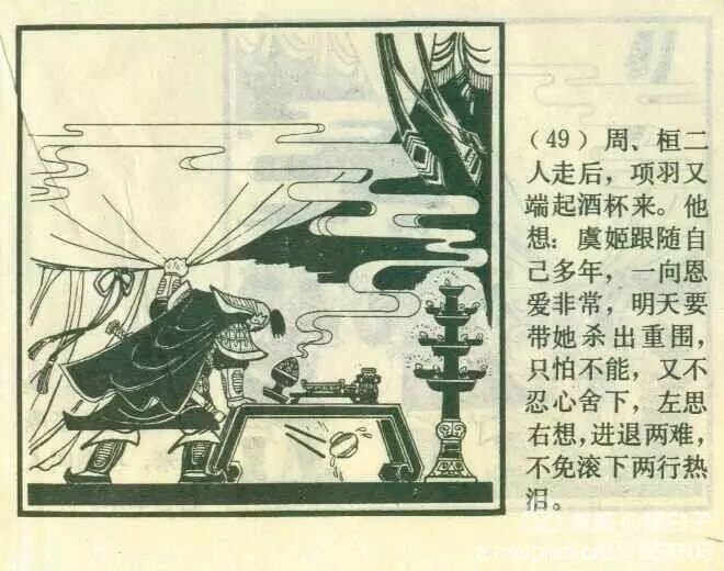 1980年由上海人民美术出版社出版,根据历史故事改编的连环画《霸王别姬》,讲的是力拔山气盖世的项羽于垓下四面楚歌,乌江自刎别虞姬的悲壮故事。