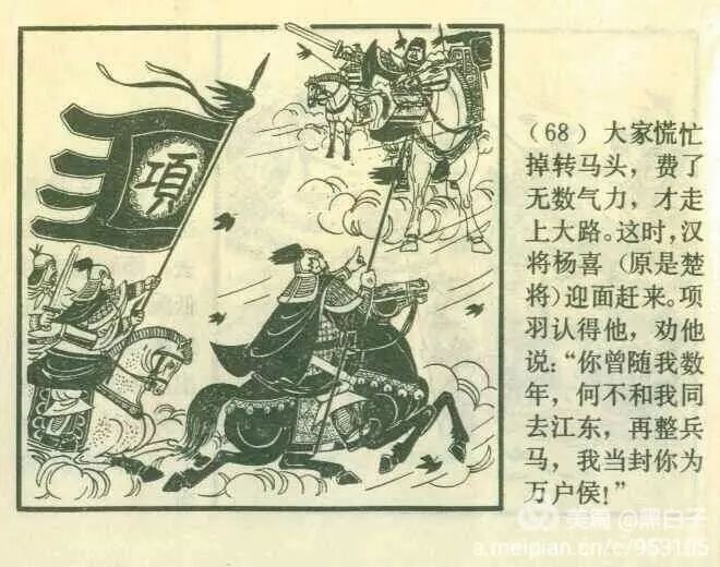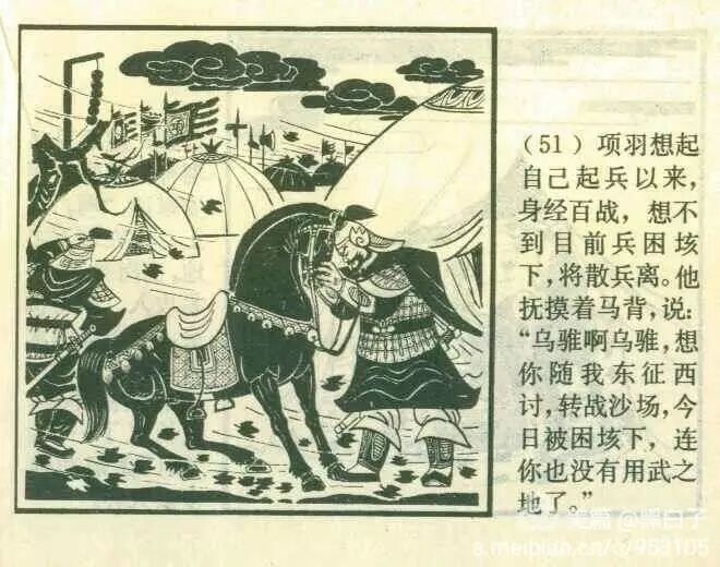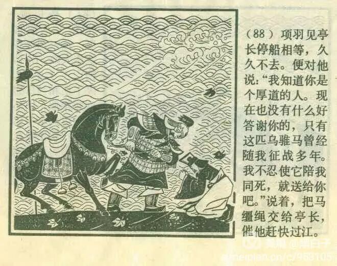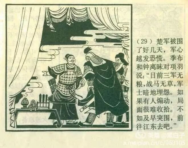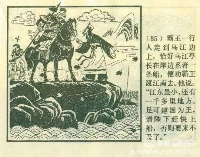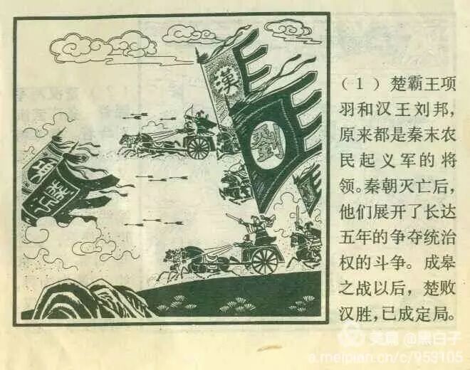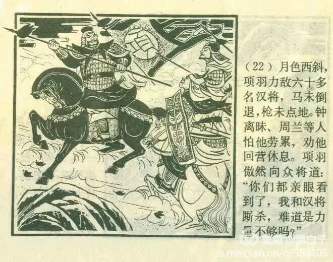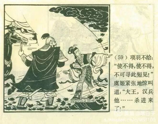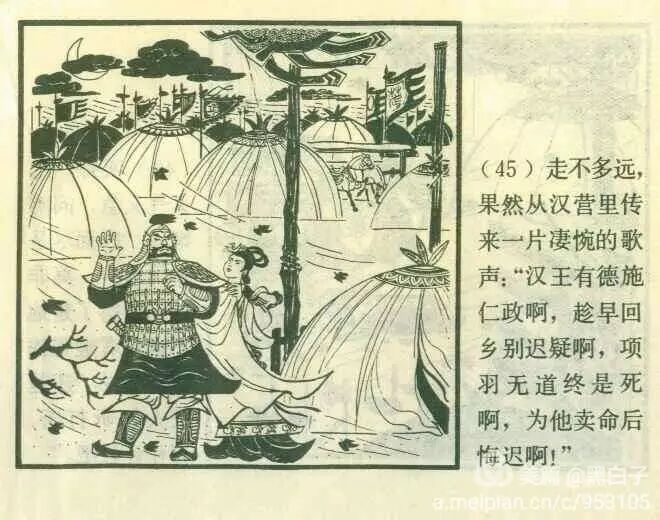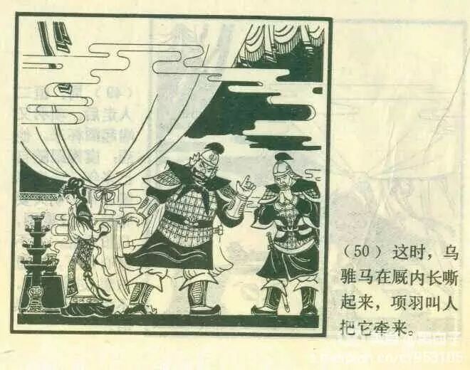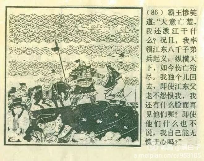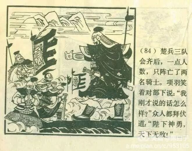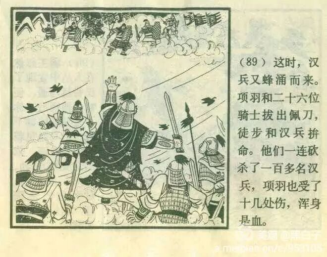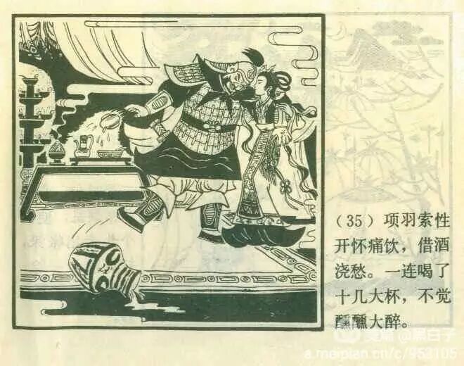 1980年由上海人民美术出版社出版,根据历史故事改编的连环画《霸王别姬》,讲的是力拔山气盖世的项羽于垓下四面楚歌,乌江自刎别虞姬的悲壮故事。