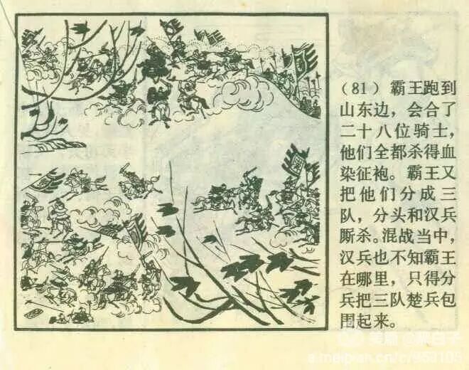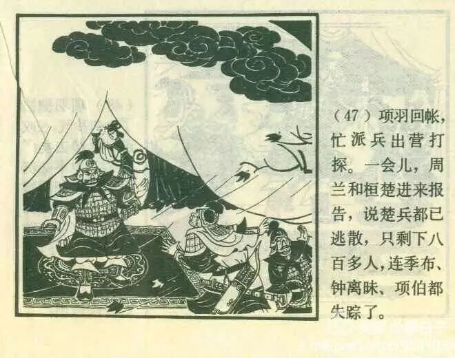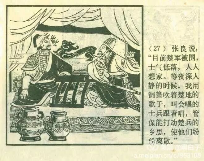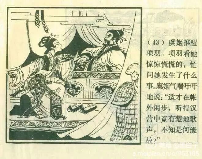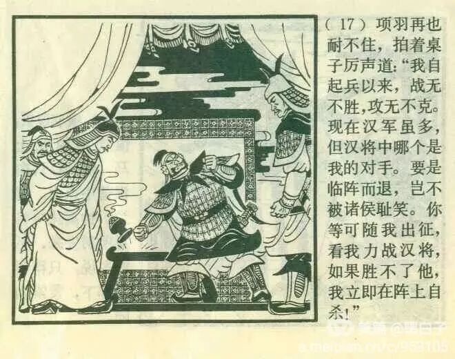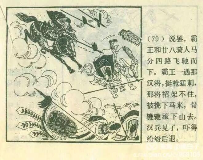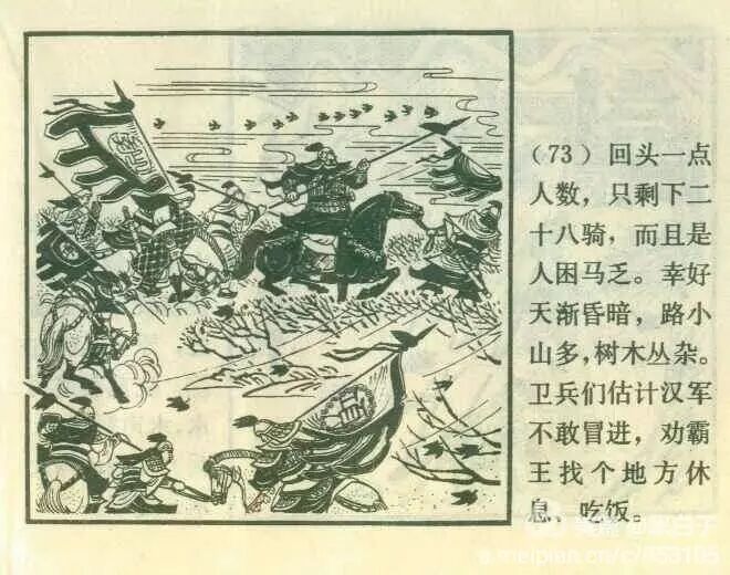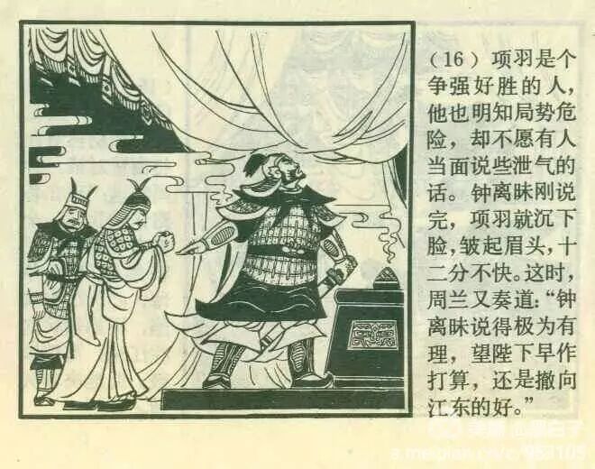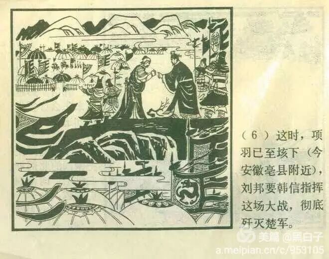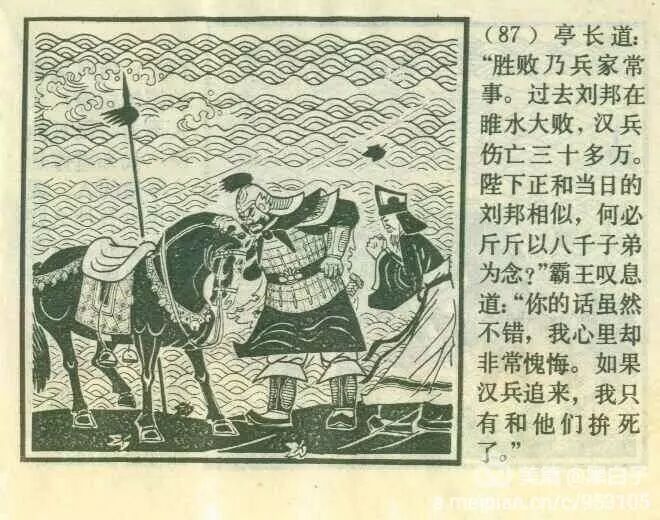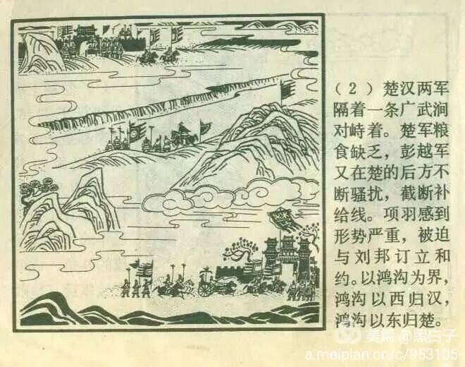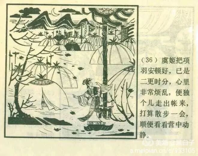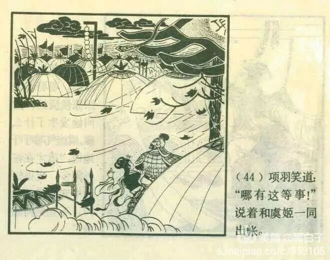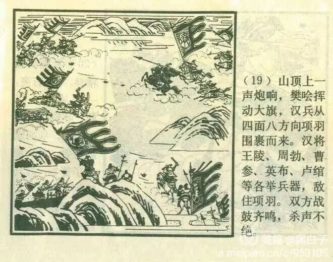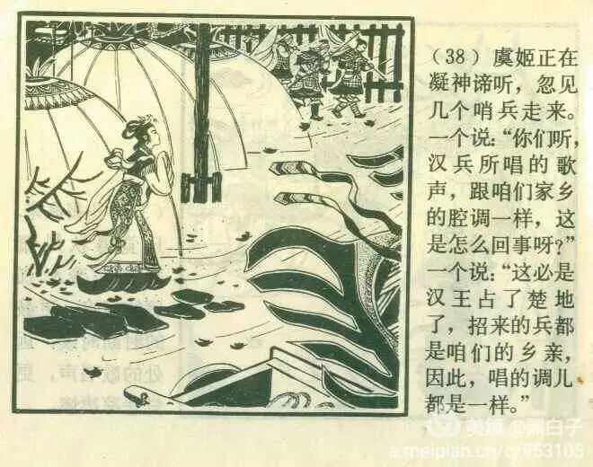 1980年由上海人民美术出版社出版,根据历史故事改编的连环画《霸王别姬》,讲的是力拔山气盖世的项羽于垓下四面楚歌,乌江自刎别虞姬的悲壮故事。