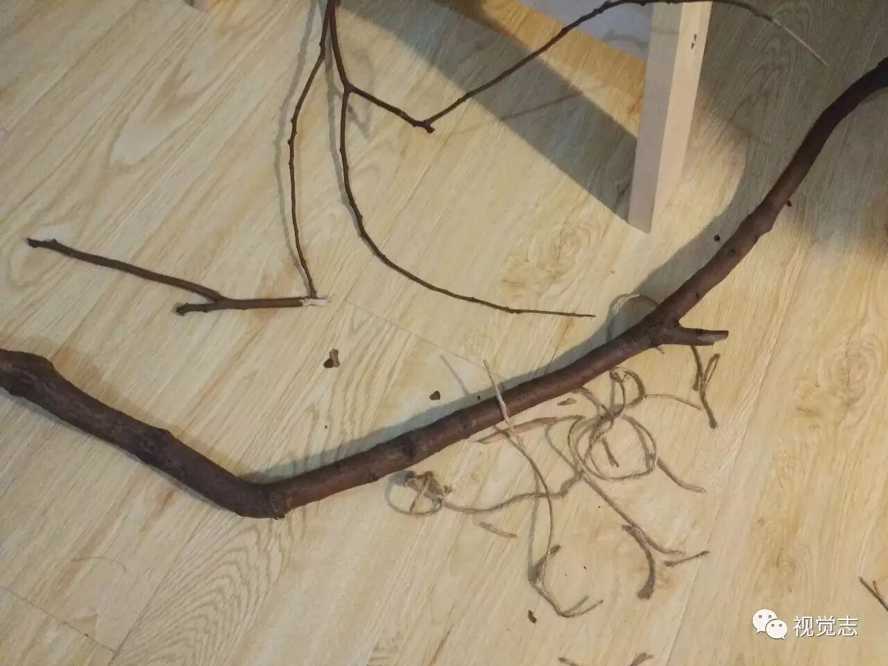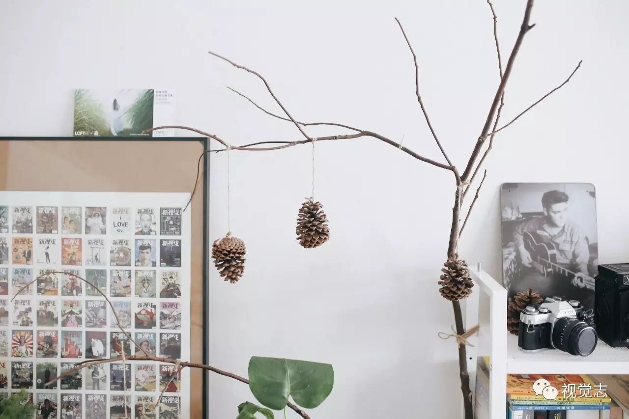 门口捡来的树枝,挂上松塔,像在家里种了一颗树。