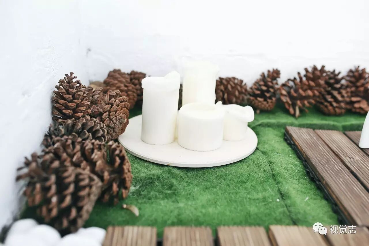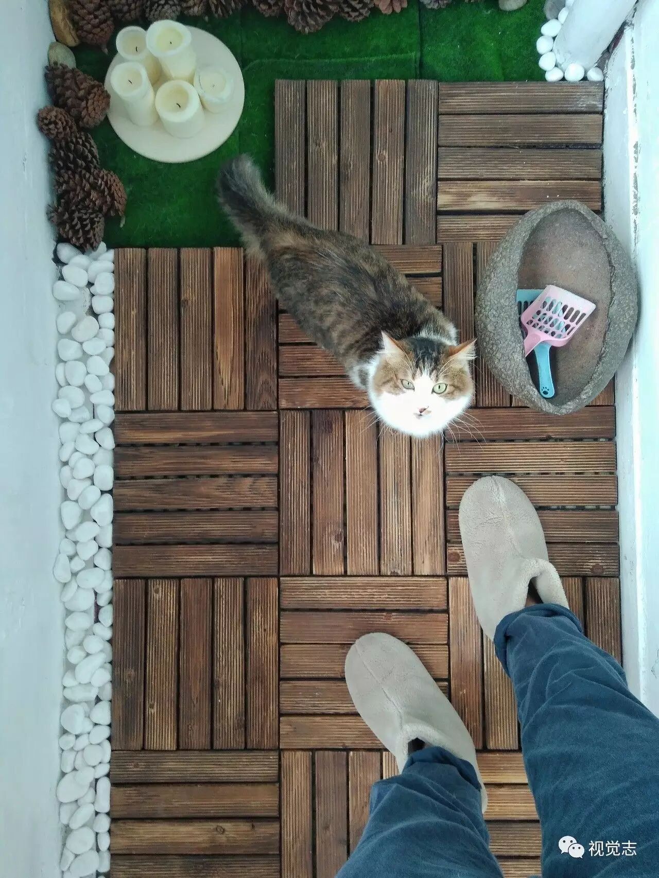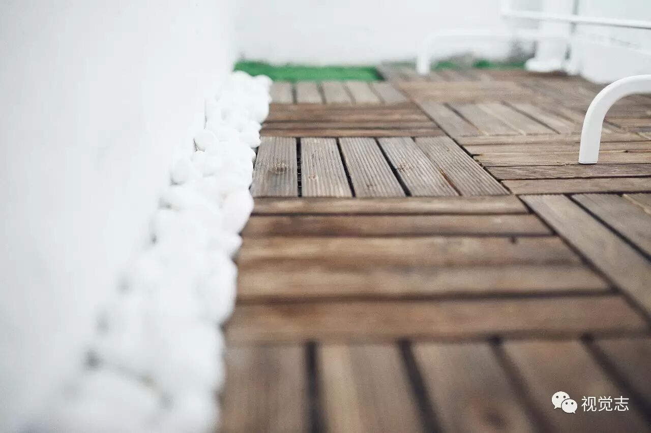 原来的阳台铺上了防腐木地板,白色石子和松果遮盖了清理不掉的角落。