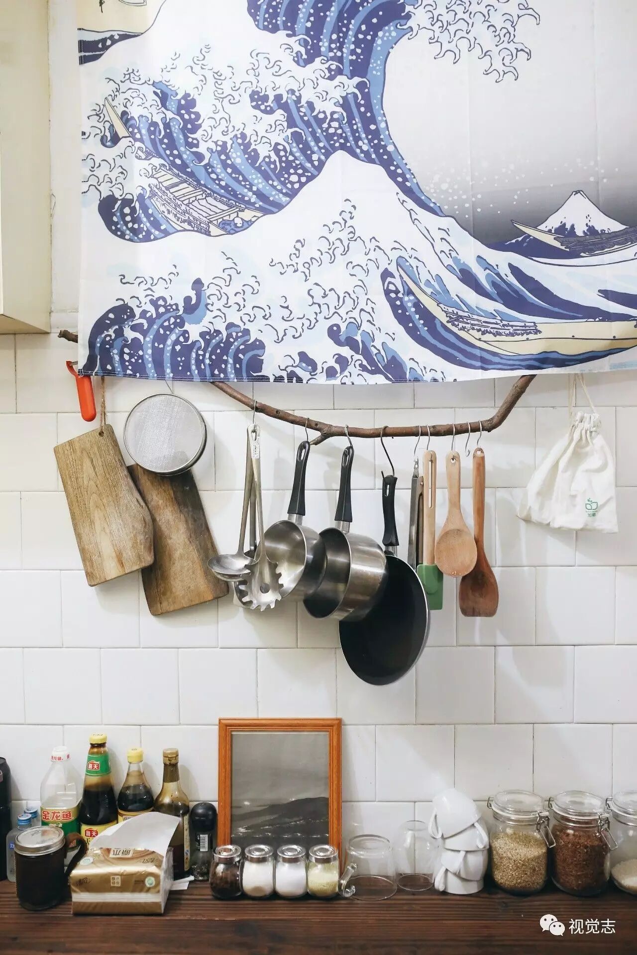 走进厨房,看到了实用简约的挂物架。