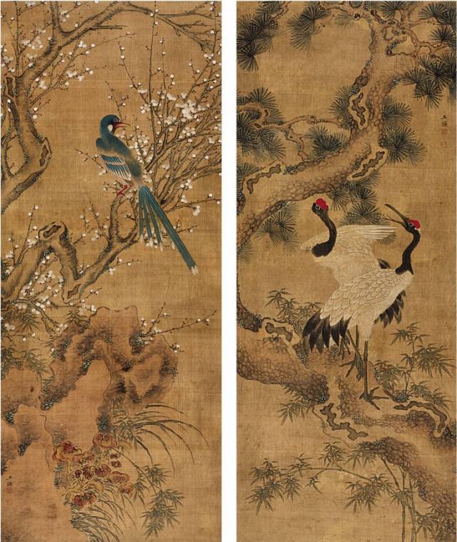 明 王谦 《梅花黄鸟图》(左) . D9 R3 X# a4 q' q+ M$ ]