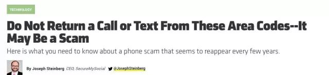 美国资讯安全公司(SecureMySocial)执行长史坦柏史多年来遇到过形形色色的电话诈骗投诉,他上列出了一些诈骗犯惯用的“危险”区号,再三提醒人们:当你不确定来电者是谁的时候,遇到以下区号,不要接听电话,让它转到语音留言,更不要回发短信!因为如果不是诈骗电话,他们会在没人接听后,留言,到时候再回电也不迟。 " D8 o1 X% }! p* Z