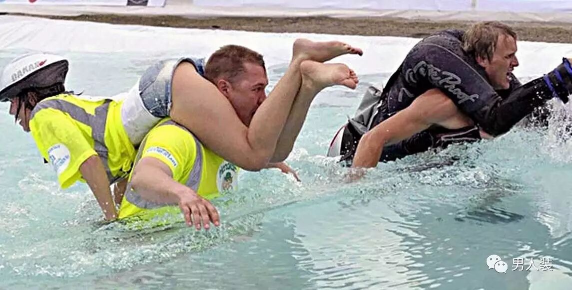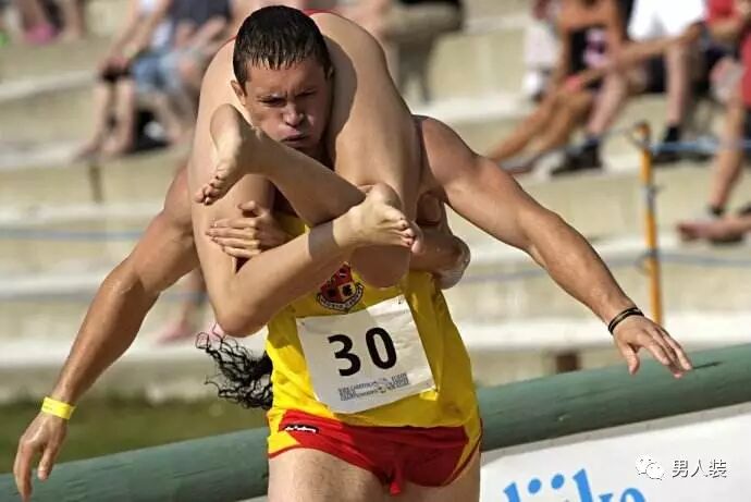 这是一个起源于18世纪的古老节日,发展至今已经形成了自己的规矩。赛事要求男选手倒背、肩扛或托抱一名17岁以上、体重不低于50公斤的女性搭档进行253.5米障碍跑,用时最短者夺冠。 + V+ F) C7 a/ h4 F& q. i! ~3 R& u
