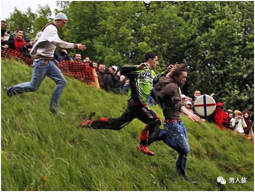 每年5月的公共假日,数以千计的英国人会跑去库珀山,参加追逐奶酪比赛。比赛内容听起来无聊,实则非常刺激: