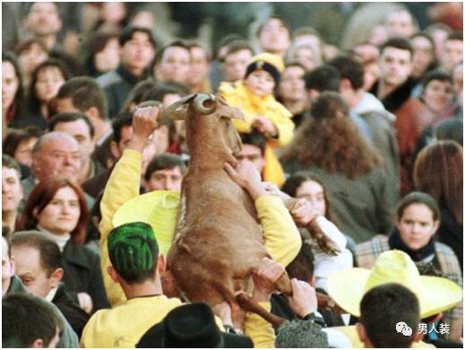 % _ K% r. l0 ^, l传说中,曾有一只山羊用自己的奶喂养了当地穷人,后来它从高塔上跌落下去却毫发无伤。为了纪念这事,当地人发明了节日当天扔山羊的习俗:他们从15米高的教堂钟楼上将一只活羊抛向人群,而下面的人则想办法用一块防水布接住它,然后再将它抬到街上游行,最后再把羊变成晚餐。2 V. e2 E1 I, c( g0 z- j