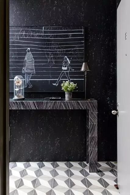 4 l+ O8 g. o, k8 h设计师David Stark和她的艺术家丈夫Migguel Anggelo重新设计了他们在布鲁克林的公寓。创造出平静流动的空间-由戏剧性物品和意想不到的细节带来活力氛围 。 入口大厅的墙壁上镶着黑色的亚麻油地毡,里面有一个大型黑板壁画。 7 O: x4 v+ ~/ w) |# W