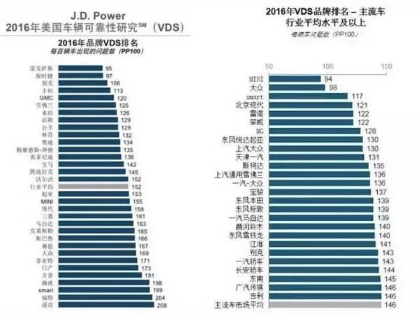 前几日各大汽车网站,各自媒体都盛传着一份榜单,亚太J.D.Power做出的中国地区主流车车辆可靠性研究排名(下图右侧),Mini,大众,Smart占据着榜单三甲!但同时期美国J.D.Power中Mini,大众,Smart却在行业平均水平下以下。这两份榜单差距“辣么”悬殊,缸哥只能“呵呵”了。/ S! \* k: w/ U4 P* P$ |$ W