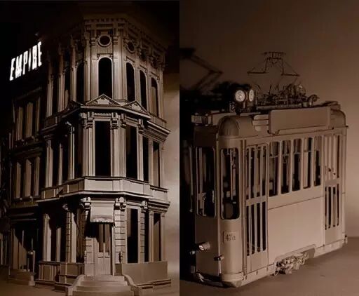 当然,作为一个定格动画导演, 他也没忘了将自己的本职工作, 结合到兴趣爱好中来, 目前,他已经制作完成了一部名为 paper city architects的定格动画短片, 短片展示了一个充满蒸汽朋克风的宏伟城市, 里面的建筑、机械、人物无一例外, 全部由Daniel Agdag用纸板和胶水手工制作而成, 2 Z/ ~. [7 ]' T; _