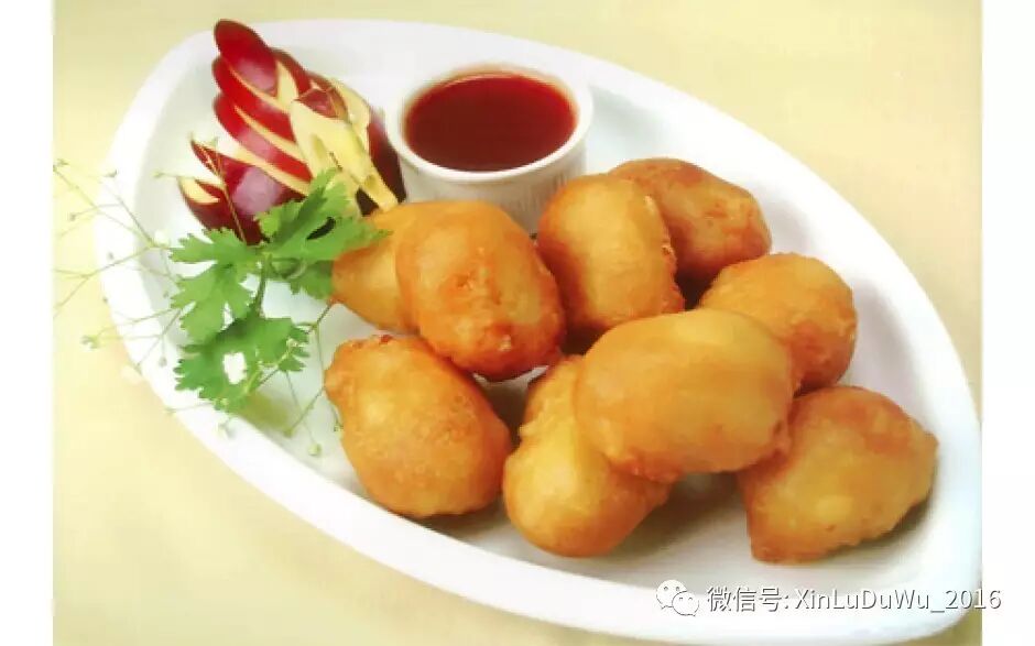 甜酸鸡(Sweet Sour Chicken)是面团裹着炸后蘸汁吃。
