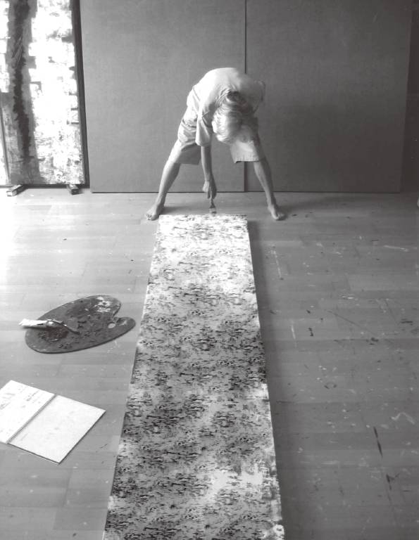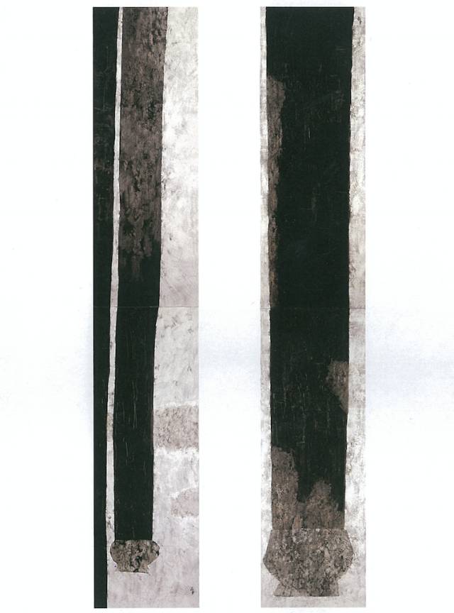 在王怀庆2006年创作的双联作《立定1&2》中,传统南方屋舍的立柱成为画中的唯一形象。画面中,木质的立柱与石头的柱础被王怀庆简化为单纯的几何矩形,显现出他在造型构成中极力求简的艺术追求。在《立定1》中旨在呈现出两条立柱之间空间结构的营造,为此其中一条立柱只入画了一半,继而见出一种视觉上的空灵与静谧。