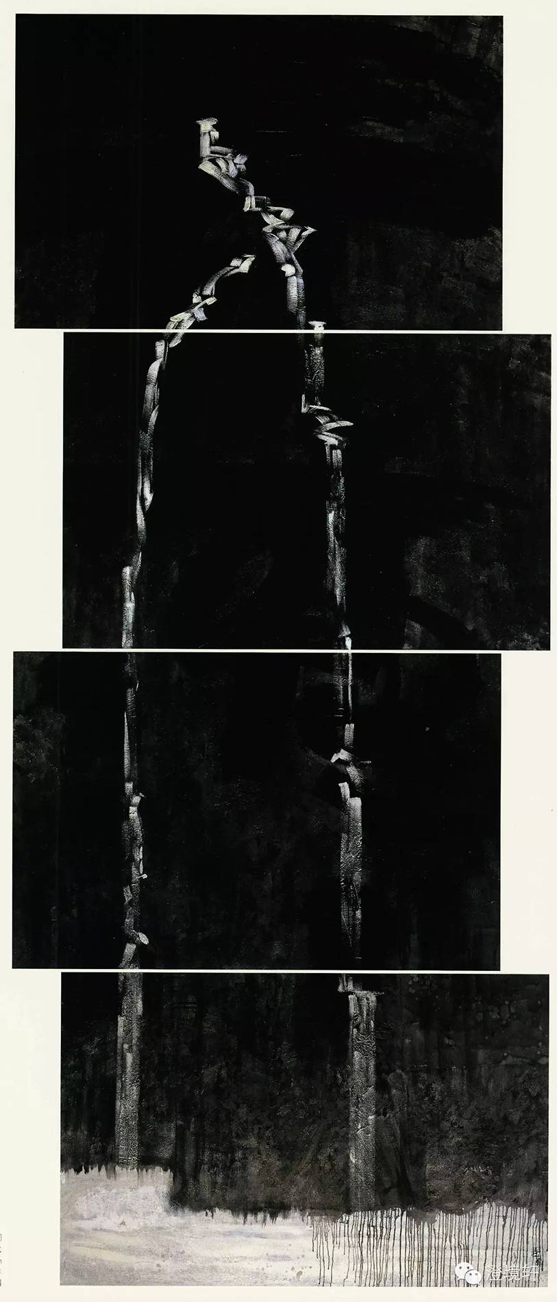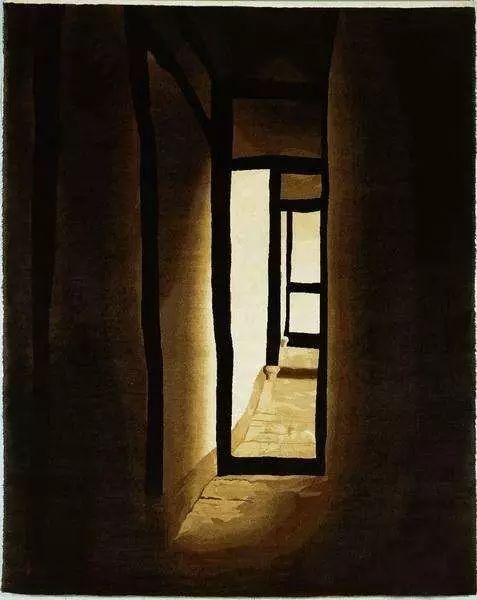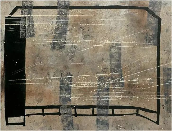 4 y } N; n3 p9 z1 F王怀庆艺术语言的确立需要追溯到1985年。王怀庆无意中找到了能够升华其“中国传统文化”主题创作的延展对象。在这一年,他因写生的缘故来到浙江绍兴,而此地黑瓦白墙的传统木构建筑却令他顿时“豁然开朗”。严丝合缝的榫卯结构,规整典雅的构件造型,黑白相间的纯粹色调,木材经久的粗粝质感、疏朗逸气的建筑空间以及与其相通的中国古典家具,都幻化为王怀庆的艺术意象与艺术语言。于是,他的画面开始走向一种以黑白为主要色彩的单纯化之路,所传达的视觉内容开始集中于古典建筑与家具,同时在造型方式上也开始转向于具象与抽象之间。
