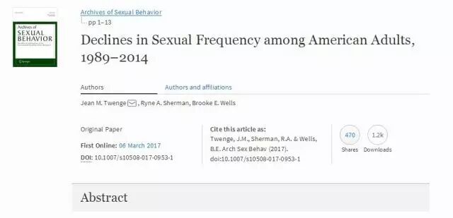 根据“Archives of Sexual Behavior”中的一项研究显示:美国成年人平均每年的性行为比90年代后期的同龄人少了至少9倍!