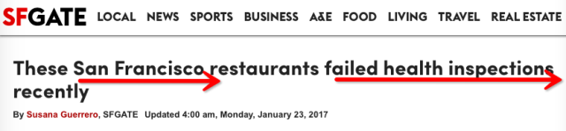 6 W, l; x9 U3 T! i" T其实美国公共健康安全局每年会抽查餐馆的卫生情况,并发布在网上,近日《SFGate》网站根据公共卫生记录,曝光出旧金山地区卫生不达标餐厅的清单,一半以上是中餐馆!有些上榜的餐厅在Yelp上甚至有很高的评价,更不乏一些在华人圈中很受欢迎的知名商家。