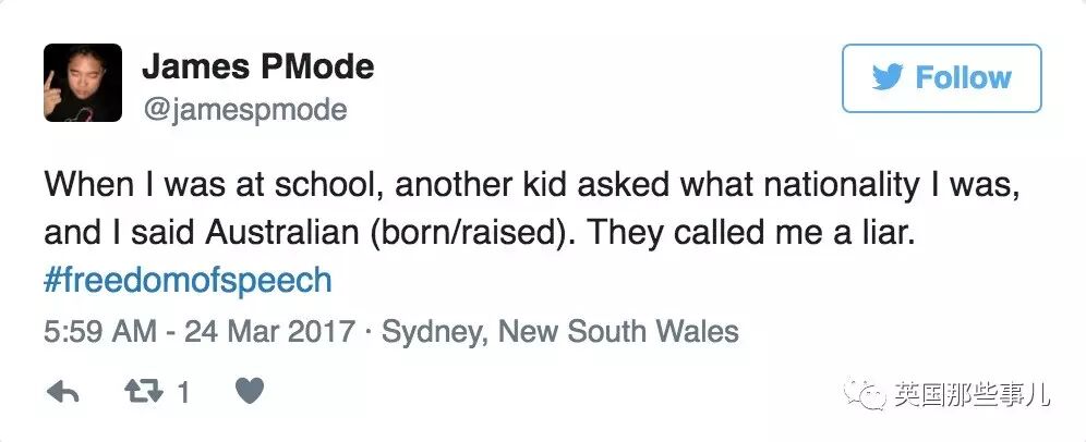 甚至有媒体列出了歧视亚洲人不会有麻烦的四条原因。 而黑人的歧视呢, 五百多万条, 其中不乏是一些黑人反抗歧视和只因大家争取权利的报道。 曾经就有媒体报道过,澳大利亚的种族歧视问题。 “华裔比原住民面临更大的歧视,90%的华裔表示他们曾因亚洲人的身份而被区别对待“。 而刚好前不久,在twitter上有个很火的tag叫#freedomofspeech,就是为了让大家说出自己在澳大利亚遭遇过的种族歧视问题, 而这些被歧视的亚裔,各种经历更是心酸。 这里面,就有很多亚裔... “十岁的时候,我在当地的游泳池玩,一群白人男孩按住我的头在水中,嘲笑我是亚洲人“。 “在学校另一个同学问我的国籍,我说澳大利亚,因为我就是在这里出生长大的,但是却因为我的亚洲面孔,他们说我是骗子“。 “哈哈,我一时想不起什么种族歧视的例子了, 因为实在是太多了“。