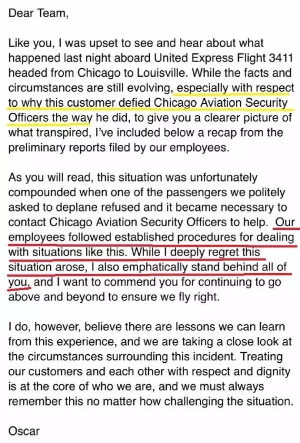 …… 随着事件愈演愈烈,特别是大家都在关心为什么这位乘客要如此违抗芝加哥航空警察,下面根据在场机组人员的报告,我来为大家做一下回顾。 …… 我们的雇员完全是按照规定办事。虽然发生了这种事情我很苦恼,但是希望大家明白,我永远支持你们,并且我要求你们继续超越标准地来保证我们的飞行。 ……
