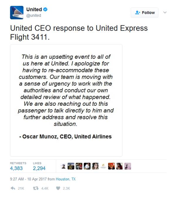 对于美联航所有人来说这是一件十分令人苦恼的事情。对于不得不重新安排旅客我深表歉意。我们的团队已经抓紧时间和相关权威部门合作,并且在对发生的事情进行详细的自我检讨。我们同时在积极联系涉事乘客希望可以与他直接对话来解决这个问题。 —— Oscar Munoz,美联航CEO