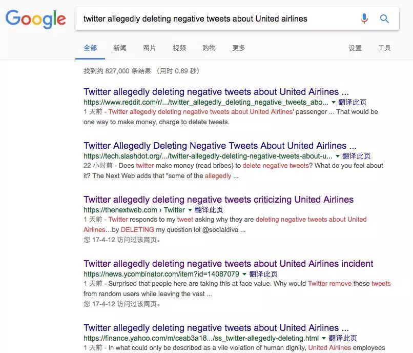 更有甚者,当你把搜索范围限定到一天之内,竟然干脆关于美联航的什么都搜不到了:
